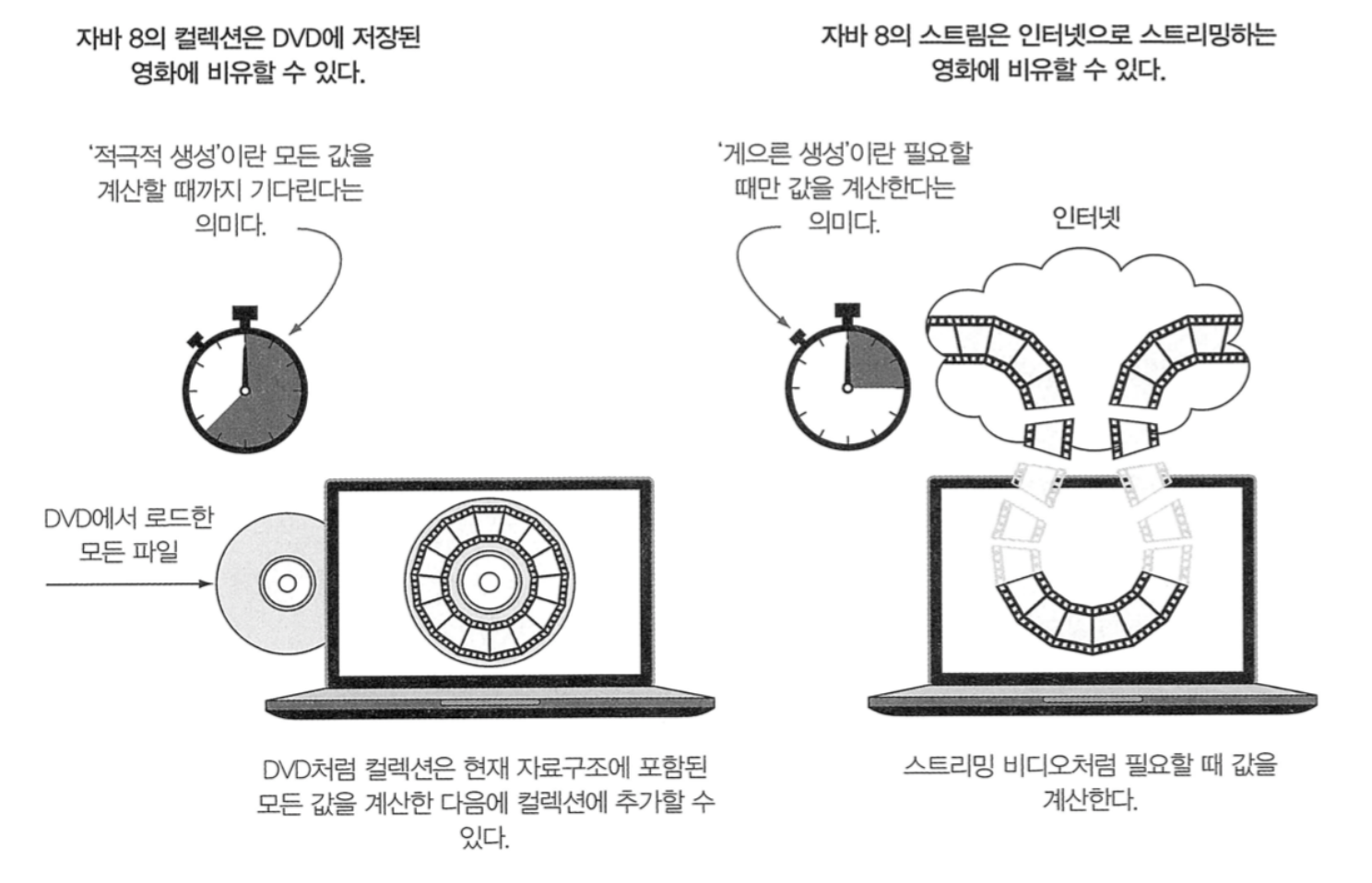 → 기존 컬렉션과 새로운 스트림 모두 연속된(순차적으로 값에 접근) 요소 형식의 값을 저장하는 자료구조의 인터페이스를 제공