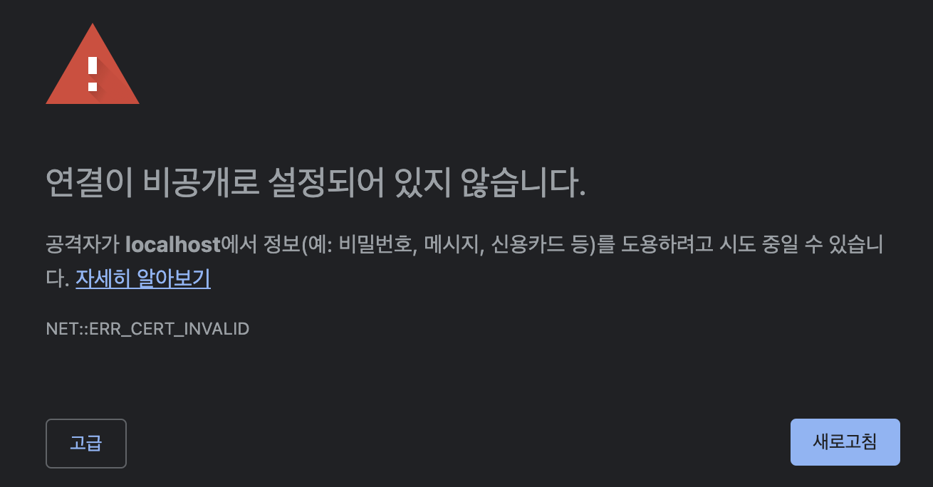 > 해당 브라우저에서 우리가 local에서 만든 인증서의 pub키를 모르기 때문